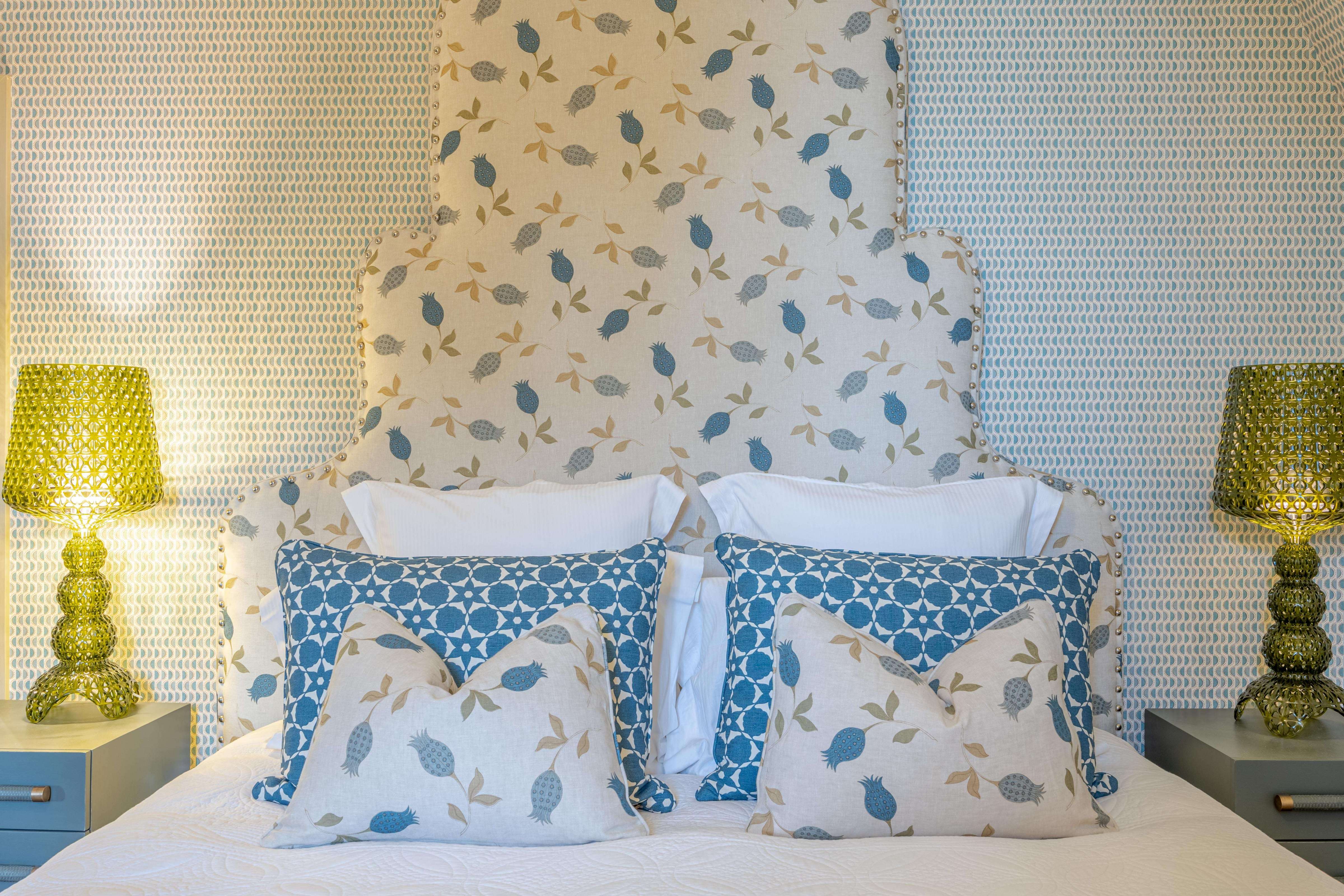 Elle offre l’espace idéal pour la famille, avec sa chambre d’enfants aux deux lits jumeaux anthracites et leurs petites tables de chevet d’un jaune vif (l’ensemble de la marque Chelsea Textiles). Aux murs de ces pièces lumineuses, un papier de la collection Ophélia (Vanderhurd) mêle bleu de Prusse et safran.