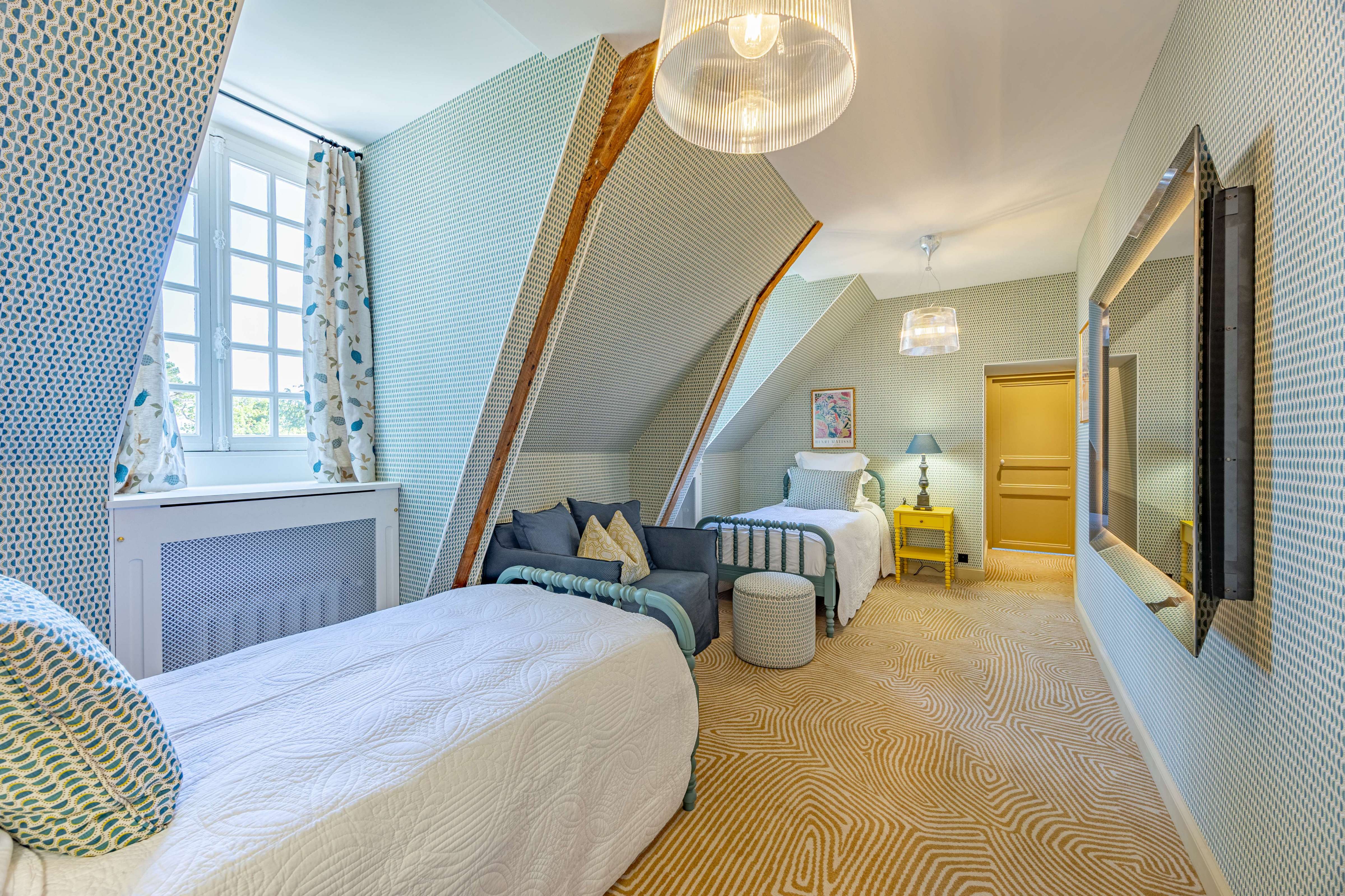 Pour l’accord, poufs et coussins sont parés du même motif, quand les rideaux ou la tête de lit monumentale de la chambre parentale se drapent du modèle ”Petite Tulipe Indigo” (Vanderhurd). Nichés à l’écart, les deux fauteuils ”Mischa” de la collection Artwood font un îlot confortable et ensoleillé pour qui veut lire ou se détendre au calme. Aux fenêtres, les rideaux dans le tissu ”Petite Tulipe Indigo” de Vanderhurd s’associent parfaitement. Deux lits jumeaux ”Bobbin”, anthracites, et leurs petites tables de chevet d’un jaune vif, créent un cocon douillet !